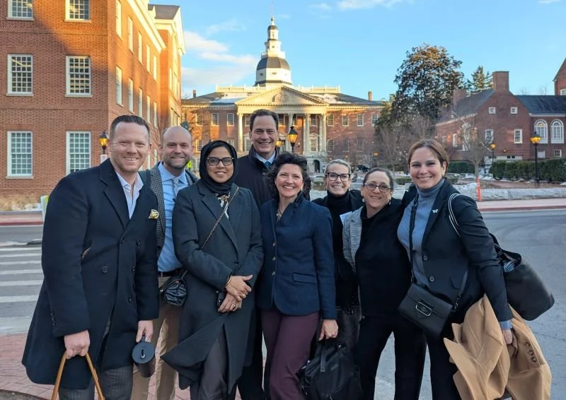 Alt-text for photo above: The photo shows eight members of Leadership Montgomery’s CORE 2026 program standing outside, huddled and smiling at camera. Location: the State House in Annapolis, MD, in background.